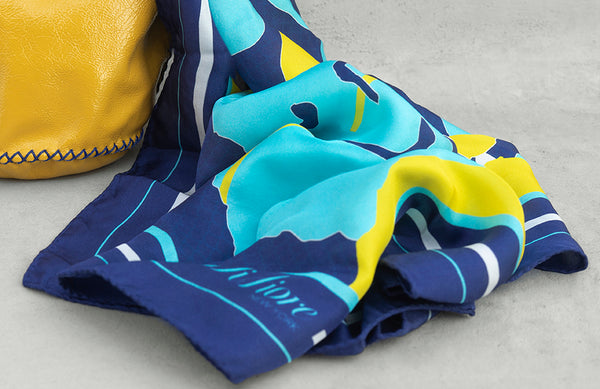 We're delighted to unveil our latest silk scarf creation, "Pagliaccio Pacifica" – a stunning addition to our collection. This exquisite piece features rich gem-inspired hues of lapis lazuli, turquoise, and citrine, creating a sophisticated palette that can be worn year-round. 💙